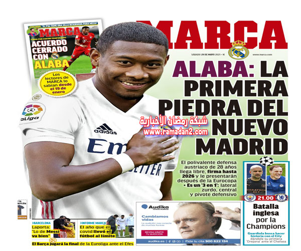 تصدر صحيفة “ماركا”، عنوان “ألابا، أول صخرة فى مدريد “الجديدة”، اللاعب النمساوي الدولي ألابا متعدد المواهب يصل إلى مدريد في صفقة انتقال مجانية بعد خروجه من بايرن ميونخ”