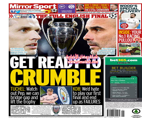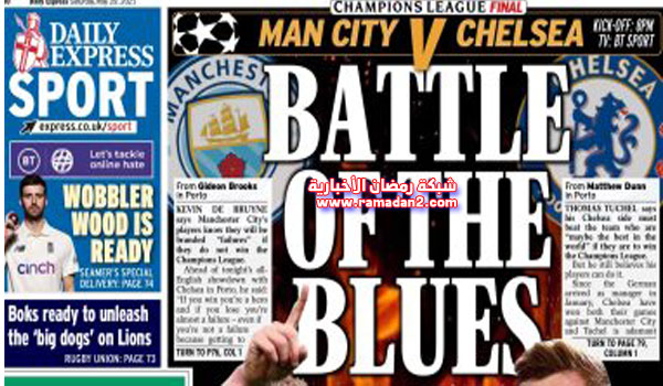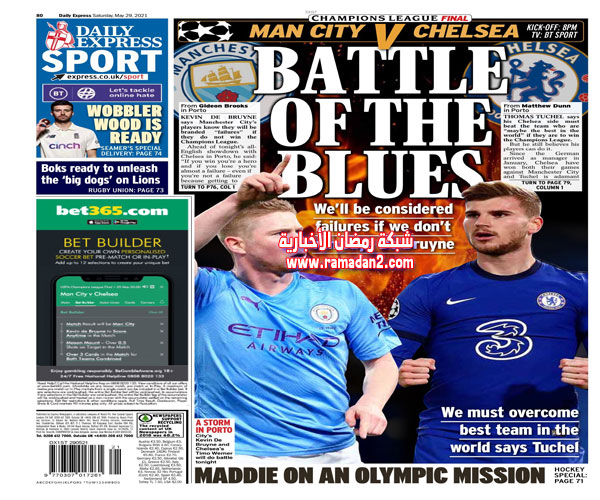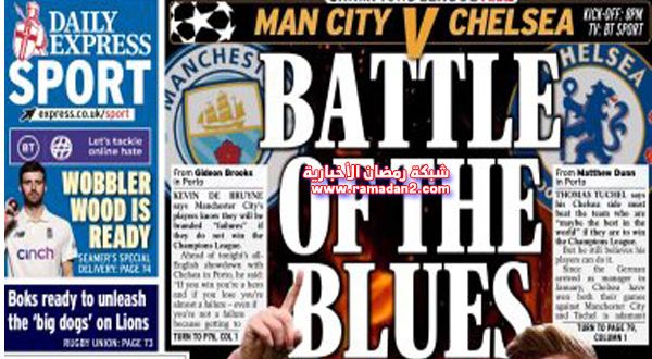 وتصدر نهائي دوري أبطال أوروبا 2020-2021 بين مان سيتي ضد تشيلسي فى المباراة المرتقبة بالبرتغال أغلفة الصحف الإنجليزية الصادرة صباح اليوم، السبت.