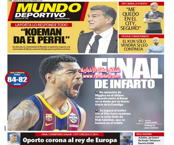 اهتمت الصحف الرياضية الصادرة صباح اليوم فى أوروبا بالعديد من الأحداث المهمة، وعلى رأسها نهائي دوري أبطال أوروبا 2020-2021 بين مانشستر سيتي وتشيلسي بملعب “الدراجاو” في بورتو بالبرتغال.