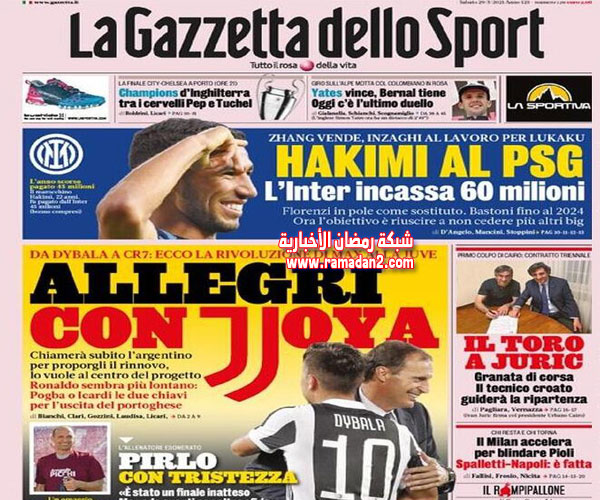 نشرت صحيفة “لاجازيتا ديللو سبورت”، قائله ” إليجري مع الجوهرة، من ديبالا إلى رونالدو، هنا ثورة أليجري، الاتصال فوراً بالأرجنتيني لتجديد عقده، رونالدو يبتعد أكثر، بوجبا أو إيكاردي مفاتيح لخروج البرتغالي، بيرلو حزين:”نهاية غير متوقعة ، سأمضي قدما في تحديات أخرى”