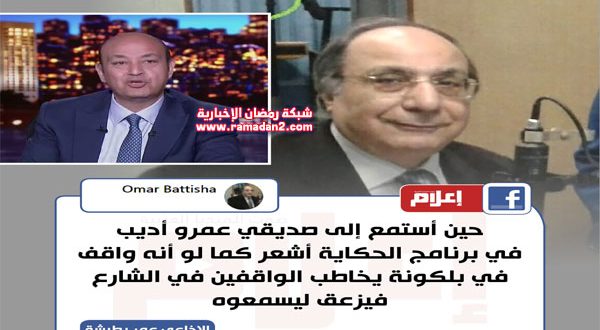 وكتب الآتي: “حين أستمع إلى صديقي عمرو أديب في برنامج الحكاية أشعر كما لو أنه واقف في بلكونة يخاطب الواقفين في الشارع فيزعق ليسمعوه”.