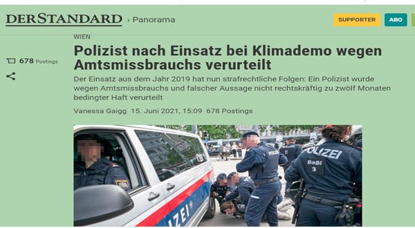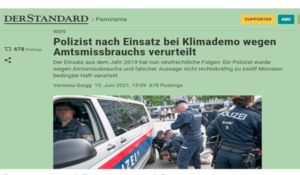 أدانت محكمة نمساوية بالعاصمة فيينا رجل بوليس نمساوى في قضية هزت الرأي العام بتهمة الاعتداء على متظاهر قد شارك في إحدى المظاهرات المنددة بغض طرف المسئولين عن قوانين حماية البيئة قبل ما يزيد عن سنة و نصف تقريباّ .