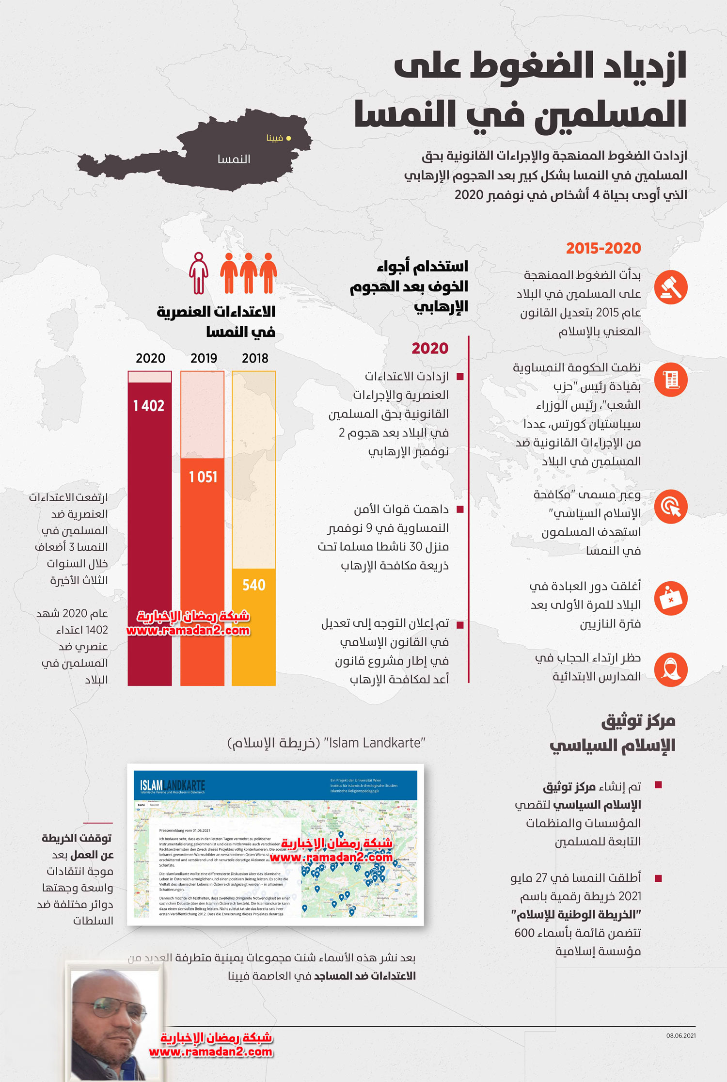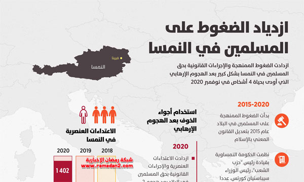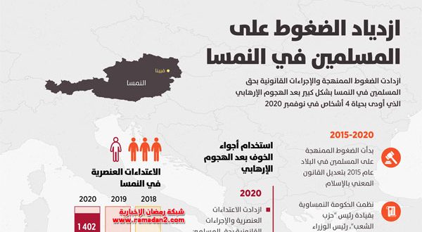 أذدادت الضغوط الممنهجة والأجراءات القانونية بحق المسلمين في النمسا بشكل كبير بعد الهجوم الإرهابى الذى أودى بحياة 4 أشخاص في نوفمبر 2020 ، حيث تعرض مسلمون في النمسا لـ 1402 اعتداءات عنصرية، خلال عام 2020، بزيادة قدرها تزيد عن 60% مقارنة بالعام 2018 وتزيد عن 50% مقارنة بعام 2019