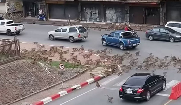 في حادث غريب، وقعت معركة شرسة بين عائلتين من القرود في أحد شوارع منطقة تبعد حوالي 100 ميل شمال العاصمة التايلاندية بانكوك