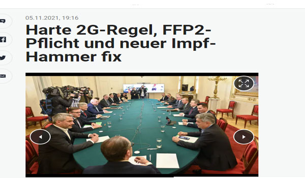نشرت الصحف النمساوية اليوم الجمعة الموافق 5 من نوفمبر 2021 ، أن الحكومة النمساوية تبدأ من يوم الاثنين المقبل الموافق 8 من نوفمبر ، حزمة جديدة من تدابير مواجهة جائحة كورونا ، تشمل تطبيق قاعدة 2G في المطاعم وصالونات الحلاقة ، قناع كورونا المعروف طبياّ بـ FFP2 في جميع متاجر التجزئة في كل مقاطعات النمسا