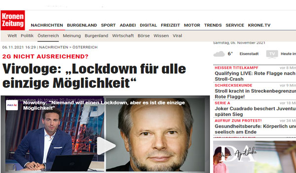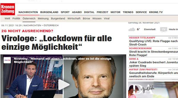 فقد نشرت صحيفة كورونا النمساوي اليومية اليوم السبت ، أنه في ضوء الزيادة المستمرة بـ إصابات كورونا الجديدة، أدلى خبير الأوبئة الدكتور Norbert Nowotny بتصريح مفاجئ اليوم السبت، “أريد أن أكون صادقاّ سأؤيد إغلاقاً قصيراً وصعباً للجميع – في أسرع وقت ممكن ” ويؤكد عالم الفيروسات، إن فرصة تطبيق قاعدة 2G على الصعيد الوطني التي أعلنتها الحكومة النمساوية يوم أمس الجمعة ستكون فعالة بنسبة 50:50، كما يؤيد Nowotny إجراء اختبارات PCR مقابل رسوم مالية.