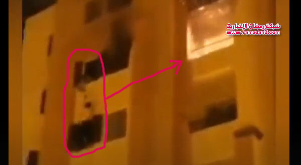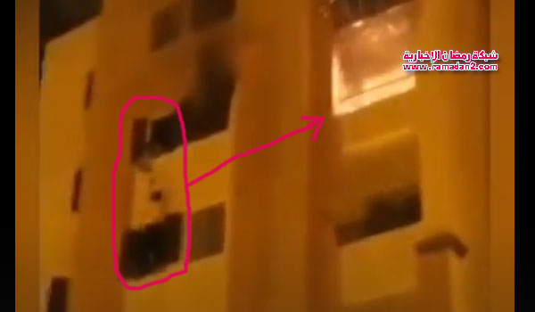 وتداول رواد مواقع التواصل فيديو لشاب يقف على حافة نافذة بالطابق الرابع ليلتقط طفلا من الطابق الخامس العلوى بسبب نشوب حريق بالشقة لينقذه من الموت.