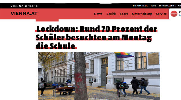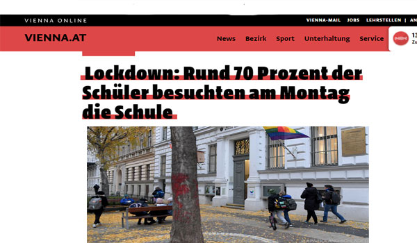 نشرت صحيفة كورونا النمساوية اليومية اليوم الأثنين ، أن حوالى من 70% من الأطفال ألتحقوا فى اليوم الأول من الإغلاق على مستوى البلاد ، مع وجود تفاوت بين ولاية وأخرى ، بالرغم من الأرقام القياسية التي تسجلها البلاد في حالات الإصابة بكوفيد ومع اقرار المسؤولين بأن العودة إلى الفصول الدراسية قد تؤدي إلى زيادة أخرى في الإصابات.