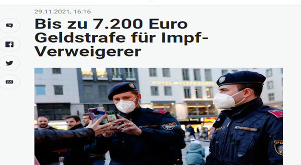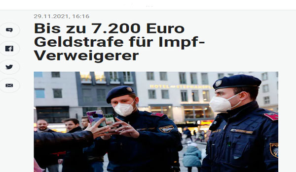 نشرت الصحف النمساوية اليوم ، إن الحكومة النمساوية تخطط لفرض عقوبات لمن يرفض التطعيم باللقاح المضاد لفيروس كورونا تصل إلى 3600 يورو ، وسيدخل حيز التنفيد بداية من شهر فبراير القادم 2022،