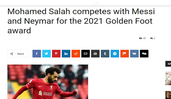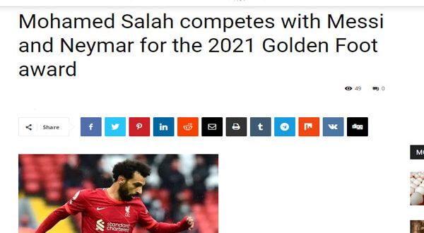 وتابعت التغطية، احتلال الدولي المصري محمد صلاح لاعب ليفربول الإنجليزي المركز السابع في جائزة الكرة الذهبية “البالون دور” لعام 2021 المقدمة من مجلة “فرانس فوتبول”، فيما جاء النجم البرتغالي كريتسيانو رونالدو في المركز السادس.