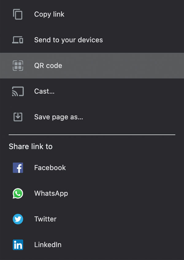كما يمكنك استخدام متصفح جوجل كروم لإنشاء رموز الاستجابة السريعة للمواقع الإلكترونية أيضاً؛ اختر عنوان URL في شريط العنوان، ثم انقر على “إنشاء رمز استجابة سريعة لهذه الصفحة/Create QR code for this page” على اليمين.