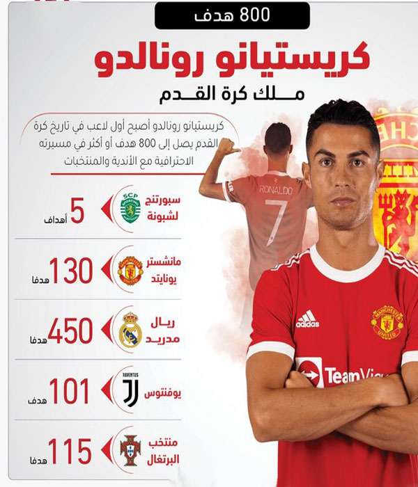 رونالدو سجل ثنائية قاد بها مانشستر يونايتد للفوز على أرسنال 3-2 في الدوري الإنجليزي الخميس الماضي، ليرفع عدد أهدافه الرسمية إلى 801 مع الأندية والمنتخبات.