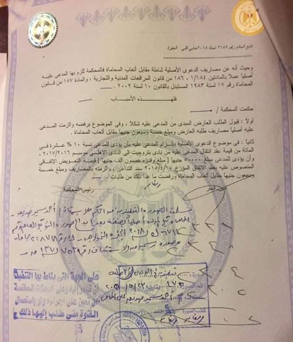 كان الوكيل عبد الهادي رفع دعوى وقت انتقاله من بتروجت إلى الأهلي عام 2016 ووقع عقد مدته 5 سنوات بقيمة 16 مليون جنيه، ويحق له الحصول على نسبة عمولة بقيمة 10% أي ما يعادل 1.6 مليون جنيه بالإضافة إلى 50 ألف جنيه قيمة الشرط الجزائي.
