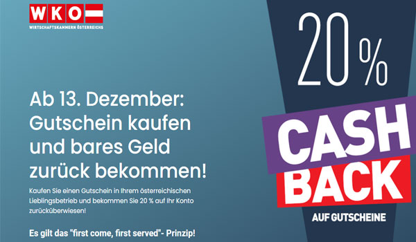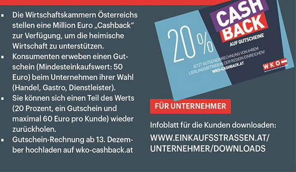 سيحصل الزبائن الذين يقومون بتحميل فواتير فسائم الشراء على موقع الويب الخاص بغرفة التجارة wko-cashback.at في الفترة ما بين 13 وحتى 23 ديسمبر على استرداد 20 بالمائة من قيمة إجمالي مبلغ الفاتورة، والحد الأدنى لقيمة الشراء هو 50 يورو، مع أسترجاع 60 يورو كحد أقصى، ويمكن تقديم فاتورة واحدة لكل شخص تحمل تاريخ من 13 ديسمبر 2021 من خلال هذا العرض الترويجي ، بجانب أن المتاجر خفضت أسعارها هذا الشهر وأن أصحاب متاجر الملابس والأعمال اليدوية هم أكثر المتاجر التي خفضت أسعارها هذا العام إجمالًا وخاصةً قبل عيد الميلاد بعد أن عانت العديد من المتاجر من وضع مالي غير مستقر لهذا فهي تتنافس بشدة من أجل تحقيق بعض الاستقرار بمبيعات عيد الميلاد.