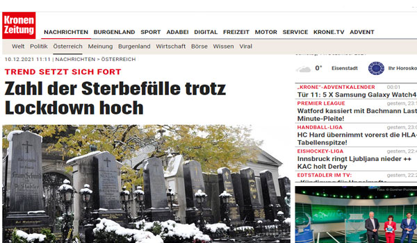 منذ شهر أكتوبر شاهدنا  معدل الوفيات مرتفع تقريبا كما كان في نفس الفترة من العام الماضي، لكن العدد يتزايد باطراد منذ  أغسطس وليس منذ أكتوبر كما العام الماضي. بالإضافة إلى ذلك، فإن عدد الإصابات حاليا أعلى بكثير مما كان عليه في الفترة نفسها من العام الماضي. كما أنه ليست هناك قيود مماثلة بسبب ارتفاع عدد الإصابات والوفيات، مثل العام الماضي، حيث تم إغلاق المراقص والحانات في الخريف الماضي وكانت هناك قيود على الاجتماعات الشخصية، كما تم حظر الكثير من الفعاليات العامة والجماهيرية ، ففي الأسبوع الأخير نوفمبر 2021، كان عدد المتوفين أعلى بنسبة 40 في المائة من المتوسط ​​للأسبوع التقويمي نفسه من فترة ما قبل كورونا 2015 إلى 2019 في العام الماضي، وكان معدل الوفيات 56 في المائة، وهو أعلى بكثير، وذلك مع عدد أقل من الإصابات بالكورونا، وذلك وفقاً لمدير عام الإحصاء النمساوي السيد Tobias Thomas..