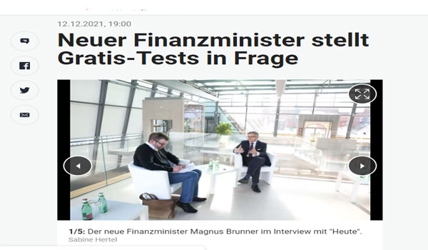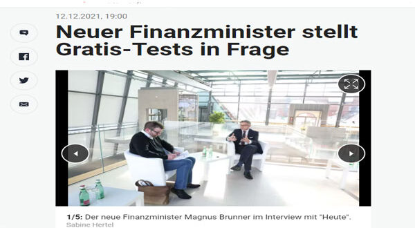 أجرت صحيفة هويتة اليومية النمساوية حواراّ صحفياّ مع وزير المالية النمساويى الجديد ” ماجنوس برونر” جاء فية ، تأكيد الوزير على أن الأشخاص غير المحصنين الجالسون في البيوت سيضطرون قريبًا إلى دفع تكاليف الاختبارات الخاصة بفيروس كورونا