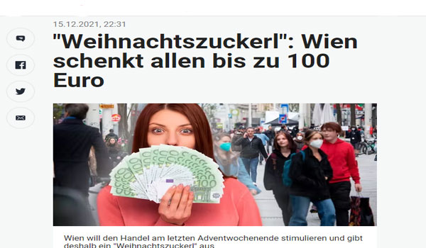 تهدف الحملة التي تنظمها مدينة فيينا وغرفة التجارة النمساوية أيضاّ، والتي بلغت قيمتها الإجمالية أربعة ملايين يورو ، إلى دعم تجارة التجزئة وقطاع المطاعم خلال عطلة نهاية الأسبوع المقبلة. لجميع العملاء الذين يتسوقون ويتناولون الطعام داخل حدود مدينة فيينا في يوم السبت ، 18 ديسمبر و بشكل استثنائي ويوم الأحد 19 ديسمبر ، هناك استرداد يصل إلى 100 يورو ، على أن يتم الشراء من متاجر كلنت مغلقة أثناء الإغلاق الشامل – لذلك يتم استبعاد محلات السوبر ماركت والصيدليات