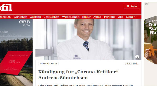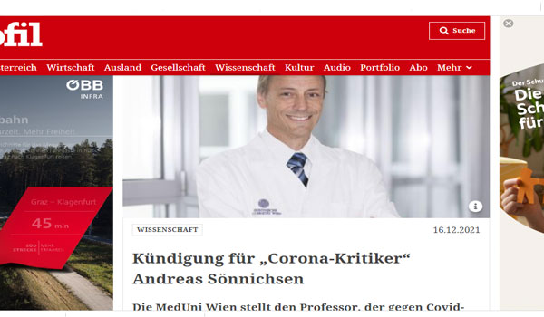 ففي خطاب مفتوح، قال أستاذ الطب الدكتور. Andreas Sönnichsen تم طردى من عملى بعد أن تحدثت مؤخراً ضد تطعيمات كوفيد 19، وفي مؤتمر صحفي، أعلن الدتور أندرياس أن ما حدث تعتبر أكبر فضيحة طبية في كل العصور وادعى كاذباً أن المرضى في وحدات العناية المركزة تم تطعيمها في الغالب.