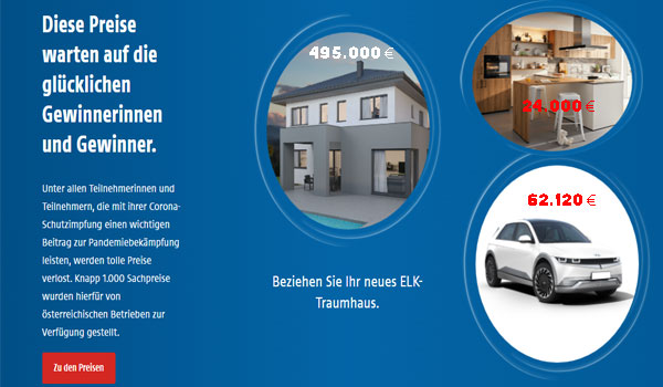 بعد أن شارك أكثر من 2 مليون على مجموع جوائز لـ 1700 جائزة ، في جائزة السحب على يناصيب التطعيم النمساوية فاز عدد من الأشخاص بجوائز ثمينة ، تم السحب على جميع الجوائز يوم الثلاثاء الماضى الموافق 21 من ديسمبر 2021 ، تحت إشراف قاضى عدل في المركز الرئيسى لـ تلفزيون ORF في فيينا باستخدام يانصيب رقمي عشوائي ، الجائزة الأولى كانت من نصيب فتاة شابة من مدينة سالزبورج تبلغ من العمر 18 عاماً عبارة عن بمنزل دورين بقيمة نصف مليون يورو ، كما فازت ممرضة من قرية Siegendorf التابعة لولاية بورجن لاند بإحدى الجوائز الرئيسية عبارة عن سيارة كهربائية قيمتها 62120 يورو قابلت الجائزة بالفرح والدموع