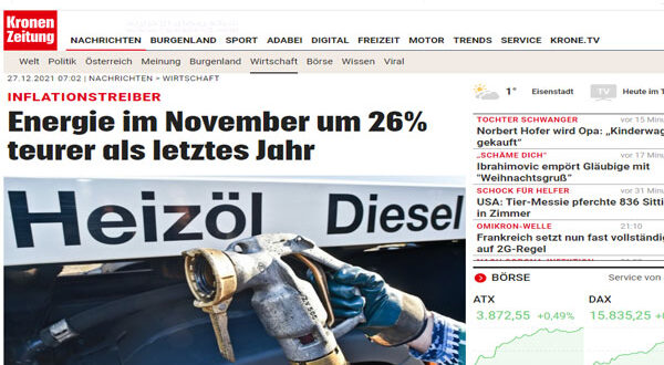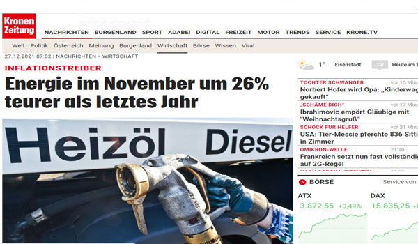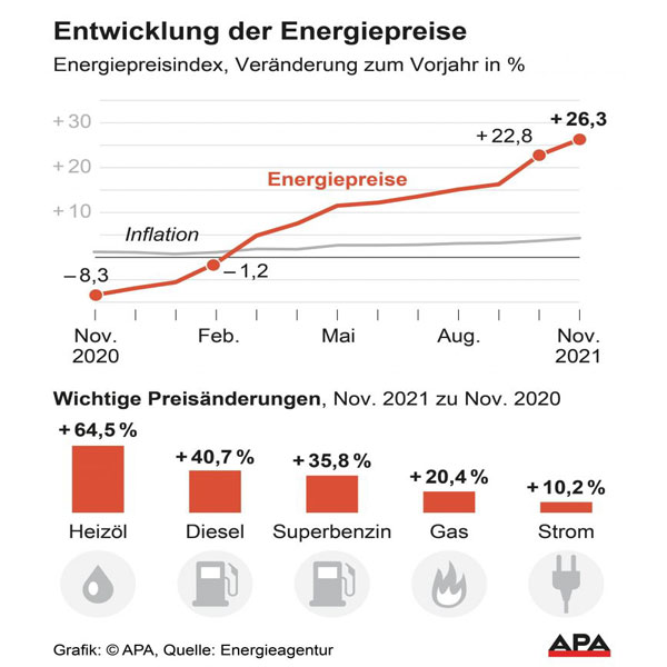 تسعى الحكومة النمساوية إلى اتخاذ التدابير المناسبة لمواجهة أزمة ارتفاع أسعار الغاز والكهرباء، ما يزيد من الضغوط في وقتٍ تبحث فيه سبل التحوّل إلى مصادر طاقة أنظف، مع تعافي اقتصاداتها من جائحة فيروس كورونا ، فقد ارتفعت أسعار الطاقة على الأسرة في النمسا بأكثر من الربع 26.3٪ مقارنة بالعام الماضي 2020 واستمرت أسعار الوقود وزيت التدفئة في الارتفاع وكانت هما السبب الرئيسي للتضخم، ارتفع زيت التدفئة بنسبة 64.5 في المائة في خلال سنة، و الديزل بنسبة 40.7 في المائة أكثر مما كانت عليه في نوفمبر 2020، والبنزين الممتاز بنسبة 35.8 في المائة، وذلك بناءً على أسعار الطاقة العالمية، ومؤشر الأسعار من قبل وكالة الطاقة النمساوية.