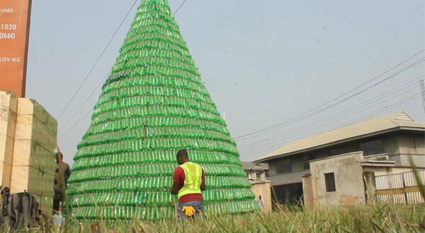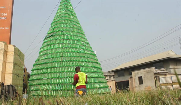 صُنعت أشجار كريسماس صديقة للبيئة من آلاف الزجاجات البلاستيكية، وإطارات السيارات المستعملة في مدينة لاجوس بالأرجنتين، ووثقت لقطات فيديو التقطت يوم الجمعة مبادرة من الناشطة البيئية تيميتوب أوكونو، أن أشجار عيد الميلاد “صديقة للبيئة” مصنوعة من آلاف الزجاجات البلاستيكية والإطارات المستعملة التي أقيمت في لاجوس.