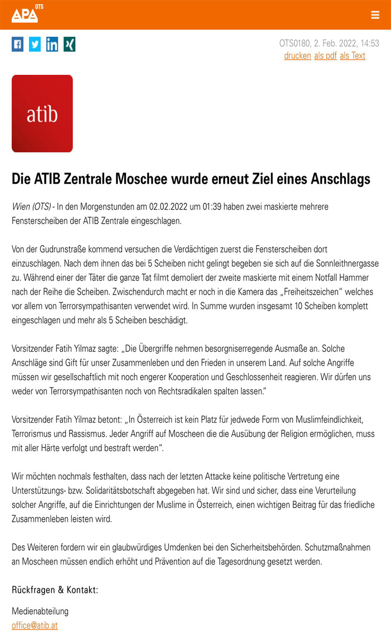 وأضاف أن القنصل التركي العام في فيينا، زار مقر “أتيب” واطلع على تفاصيل الحادثة، مطالبا بـ”إلقاء القبض على المعتدين وتسليمهم للعدالة”.