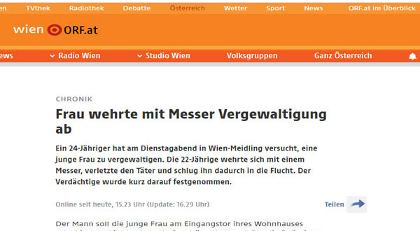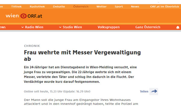 شهدت العاصمة النمساوية اليوم بالحى الثانى عشر، عملية طعن للأجئ سورى يبلغ من العمر 24 سنة ، عندما قام الشاب في محاولة أغتصاب لفتاة تبلغ من العمر 22 سنة بعد أن دفعها في فناء منزلها أثناء فتح باب الشارع الرئيسي ، ويعتقد أن الفتاة أمسكت سكين حاد وطعنت الشاب عدة طعنات متفرقة في جانبه أو الظهر أو البطن أثناء دفاعها عن نفسها.