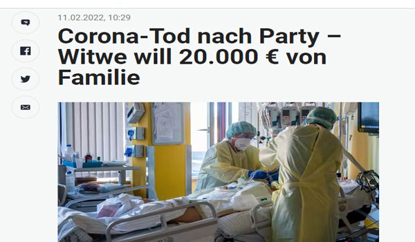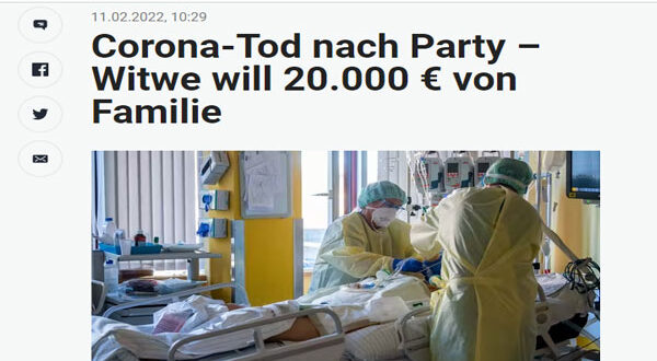 تداولت اليوم الصحف النمساوية قصة أرملة نمساوية في ولاية كارنتن النمساوية ، توفى زوجها بعد أن أصيب بفيروس كورونا في احتفال عائلي في الربيع الماضى ،والتي تطالب أرملة المتوفى الأن بتعويض قدره 20 ألف يورو من الأقارب مما تسبب في نزاع قانوني يثقل كاهل عائلة بأكملها ، حيث تطالب امرأة بتعويض حزن قدره 20 ألف يورو من رجل من دائرة أقاربها لأن زوجها البالغ من العمر 70 عاماً توفي بسبب الإصابة بفيروس كورونا، وذلك وفقاً لما أوردته الصحف اليوم