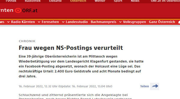 وبحسب لائحة الاتهام، قيل إنها نشرت تعليقات على صفحة على فيسبوك في صيف 2020، والتي وجهت لها اتهامات بإعادة تفعيل النازية، وكتبت في مجموعة ذات صلة عبر فيسبوك تضم حوالي 19 ألف عضو: “الهولوكوست كذبة كبيرة” ونظراً لأن هذه المجموعة منظمة من كارنتن، فإن السيدة من النمسا العليا التي كانت بريئة سابقاً تخضع للمحاكمة هنا.