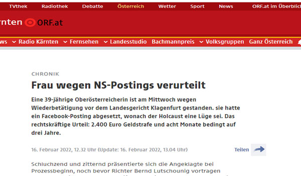 حكمت محكمة نمساوية في مدينة كلاجن فورت يوم الأربعاء الماضى على أمرأة بدفع غرامة مالية قدرها 2400 يورو وسجن مشروطة بثلاث سنوات ، بعد إدانته بإنكار ما يسمى الهلوكوست محرقة اليهود في ألمانيا النازية ، من خلال منشور لها على الفيسبوك تقول فيه إن الهولوكوست كذبة وهي تهمة يعاقب عليها القانون النمساوى