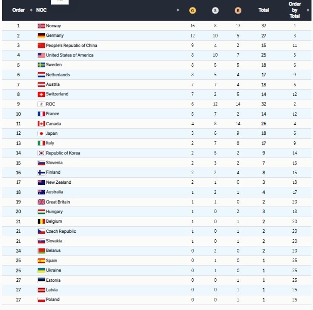 تربعت النرويج على صدارة جدول ترتيب ميداليات النسخة الـ24 من الألعاب الأولمبية الشتوية “بكين 2022″، التي استضافتها الصين بالفترة بين 4 و20 فبراير الجاري