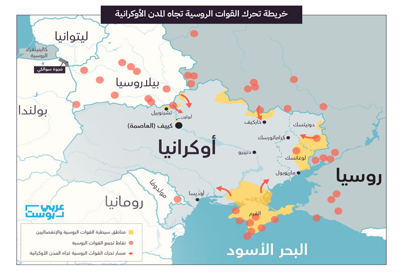 شهد يوم الجمعة 25 فبراير/شباط 2022، تطورات عسكرية عدة في الهجوم الذي تشنه روسيا على المدن والبلدات الأوكرانية، فبالتزامن مع القصف الجوي الذي يستهدف العاصمة كييف وبلدات أخرى، تزحف القوات الروسية والانفصاليون التابعون لموسكو من الأطراف الحدودية الشمالية والغربية والجنوبية.
