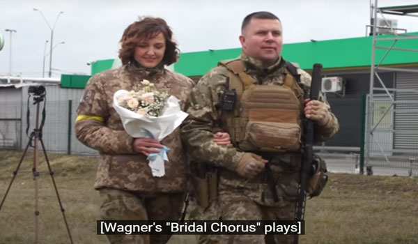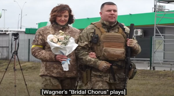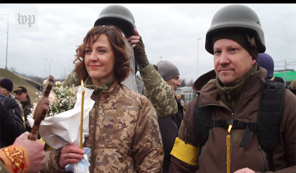 خطف جنديان أوكرانيان الأنظار عندما عقدا قرانهما، الأحد 6 مارس/آذار 2022، في العاصمة الأوكرانية كييف بالزي العسكري، وأرفقت العروس زيها بطرحة بيضاء فيما ارتدى العريس خوذة عسكرية بدلاً من التاج المعتاد، وفق ما ذكره تقرير صحيفة The Washington Post الأمريكية.