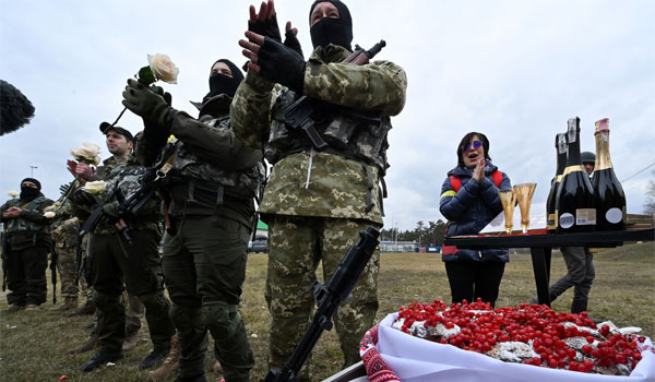 بينما كان القسيس ورفاق العروسين في قوات الدفاع الأوكرانية، الذين اصطفوا للمشاركة في موكب الزواج حاملين قذائف صاروخية وصواريخ مضادة للدبابات، يرتدون الزي العسكري أيضاً.