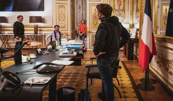 وقد وثق هذه الصور حساب المصورة الرسمية للرئيس الفرنسي Soazig de la Moissonnière، والتي تظهر لقطات عدة لماكرون وهو يعمل.