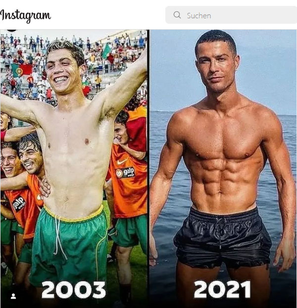 ويظهر النجم اللامع في عالم كرة القدم وهو نحيل الجسم وبشعر أشقر، فيما يبدو في الصورة الحديثة وهو يستعرض عضلاته المفتولة.
