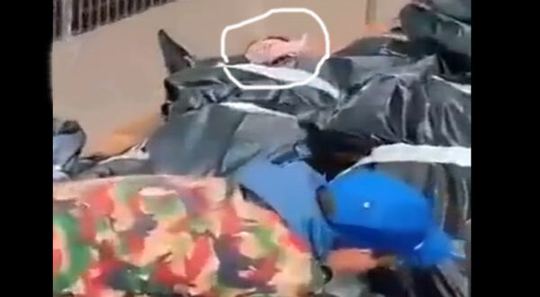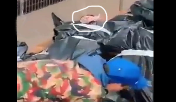 وفي المقطع الذي تبلغ مدته 12 ثانية، يرقد رجل داخل كيس أسود وذراعه في الخارج ممسكة بسيجارة مشتعلة يتصاعد منها الدخان. ويبدو أن شخصين آخرين يرتبان أكياس الجثث في الجزء الخلفي من شاحنة برتقالية خارج مبنى أبيض.