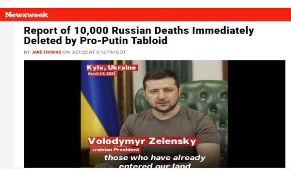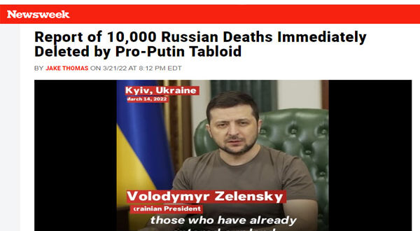 أعلنت صحيفة كومسومولسكايا برافدا الروسية، الموالية للكرملين، أن قرابة 10 آلاف جندي روسي قتلوا في أوكرانيا وجرح 16 ألف آخرين، قبل أن تزيل سريعًا حصيلة القتلى من موقعها على الإنترنت ، أما وزارة الدفاع الروسية قد صرحت عن مقتل نحو 500 جندي فقط.