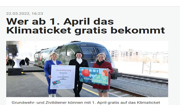 واضاف الصحف النمساوية الصادرة اليوم الثلاثاء الموافق 22 من مارس 2022، سيتمكن للموظفين العسكريين والمجندين المدنيين اعتباراً من 1 أبريل القادم ، كما جاء في المؤتمر الصحفى ، يمكن طلب هذه التذكرة في مراكز بيع التذاكر، كما أعلن ذلك المسؤولون في الحكومة اليوم، ولن تكون التذكرة المجانية صالحة فقط لطريق العمل، ولكن أيضاً لجميع الطرق الخاصة