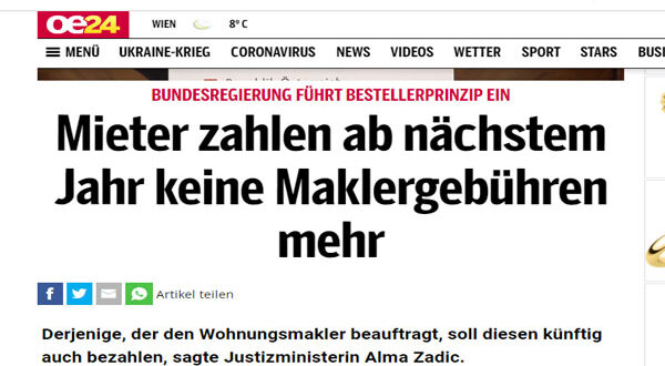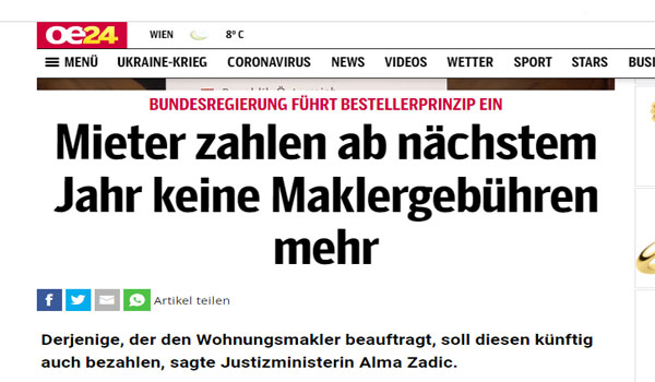 و حسب ما ذكرت الصحف النمساوية ، يعد هذا القانون الجديد خطوة مهمة للأمام نحو التخفيف، خاصة في أوقات التضخم العالية التي نحن بصددها الأن، كما أوضحت وزيرة العدل ، أن تعديل القانون الخاص برسوم السماسرة العقاريين ، وفى حالة الموافقة عليه من البرلمان سيتم تطبيق القانون أعتباراّ من العام القادم 2023 ، في إعفاء المستأجر من دفع رسوم السمسار، و في المقابل سيكون على الجهة التي كلفت السمسار بالبحث عن مستأجر للعقار بدفع أتعاب السمسار. و غالبا ما تكون هذه الجهة هو المالك.