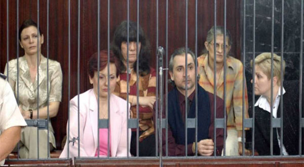 يظهر في الصورة عدد من النساء مع رجل في ما يبدو أنه قفص في محكمة.