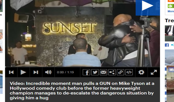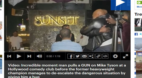 نشرت صحيفة “ديلي ميل” البريطانية ، مقطع فيديو ، لأحد معجبي ملاكم الوزن الثقيل السابق مايك تايسون وهو يسحب مسدسه ، ويوجهه صوبه، أثناء تواجدهم في نادٍ للكوميديا في هوليوود يوم الثلاثاء الماضي .