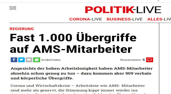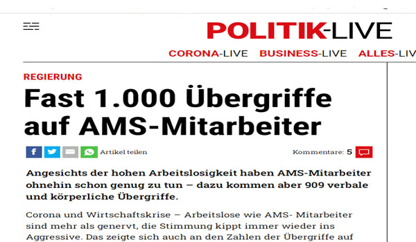 ووفقا لمعلومات حصلت عليها الصحف النمساوية ، أن فيروس كورونا والأزمة الاقتصادية جعلت العاطلين عن العمل وموظفو AMS منزعجون أكثر من غيرهم، والحوارات بينهم أصبحت عدوانية في بعض الأحيان لأسباب كثيرة، وكل هذه الظروف انعكست في عدد من الهجمات على موظفي مكتب العمل AMS.