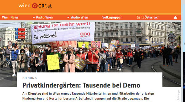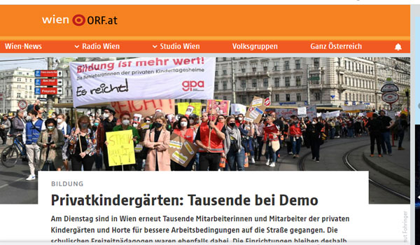 نظم الآلاف من العاملين في دور حضانات الأطفال الخاصة “رياض الأطفال” مظاهرة حاشدة ، اليوم الثلاثاء الموافق 29 من مارس ، بوسط العاصمة النمساوية فيينا ، يطالبون فيها بظروف عمل أفضل وزيادة الأجور وعمال مهرة قادرين على تحمل المسئولية ، فضلا عن الاحتجاج على ارتفاع نفقات المعيشة
