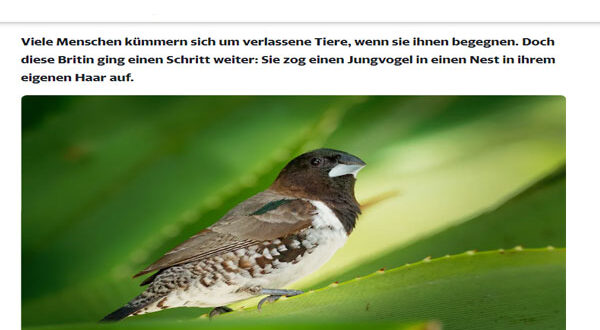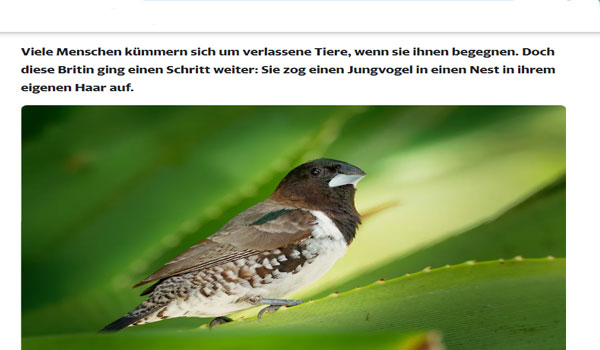 أن يعيش عصفور على رأسك وبين خصل شعرك، فهذا شعور لا يوصف. حيث عاشت امرأة بريطانية تجربة ربما هي الأولى من نوعها، حيث عشش عصفور صغير في شعرها لمدة 84 يوماً وفقا لصحيفة «نيويورك بوست».