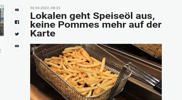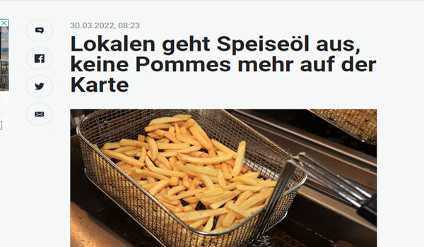 ووفق جمعية الفنادق والمطاعم في فيينا ولاية شمال الراين ويستفاليا DEHOGAفى ألمانيا ، فإن احتياجات هذا المطعم ليست حالة منعزلة، كما قال المتحدث باسم الجمعية، في تصريح لوكالة الأنباء النمساوية (APA): “لدينا وضع متوتر يكون فيه الحصول على أنواع معينة من زيت القلي، مثل زيت عباد الشمس، أكثر صعوبة من المعتاد”.