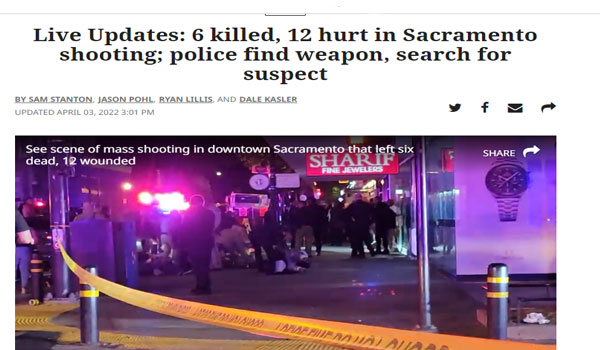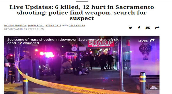 حيث قالت إدارة شرطة مدينة ساكرمينتو، في بيان نشرته على “تويتر”، إن ما لا يقل عن ستة أشخاص لاقوا حتفهم، وأصيب 10 آخرين في إطلاق نار وقع في ساعة مبكرة من صباح يوم الأحد وسط مدينة ساكرامنتو.