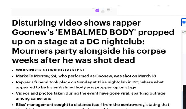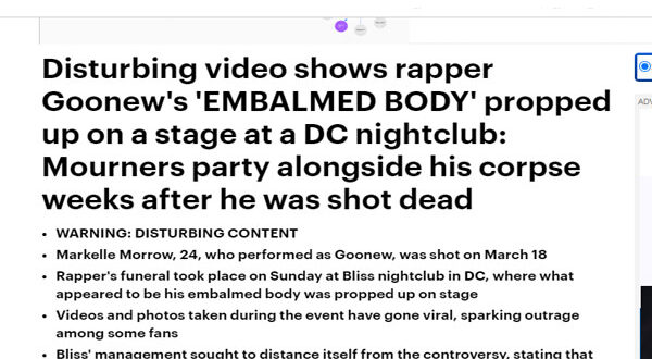 وأخرج هؤلاء الأشخاص جثة مغني الراب الشهير “Goonew” الذي قُتل قبل أسابيع بـ أطلاق النار علية من كفنه ووضعوا تاج على رأسه.