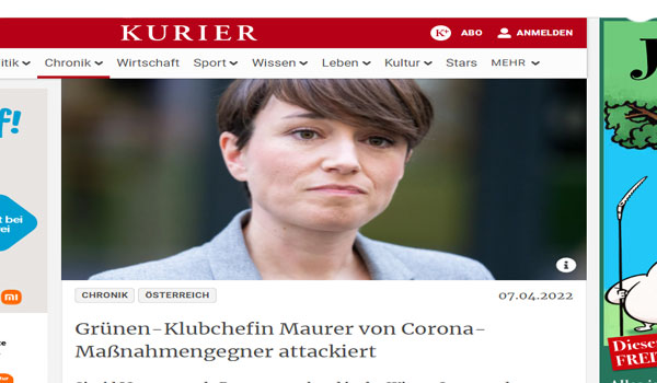 تعرضت سيجريد مورير يوم أمس الخميس الموافق 7 من أبريل زعيمة كتله حزب الخضر في البرلمان النمساوي ، إلى هجوم من قبل معارض للإجراءات التي تنتهجها الحكومة النمساوية لمكافحة فيروس كورونا المستجد (كوفيد-19). يبلغ من العمر 26 عام