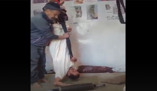 في مشهد مرعب يشبه جلسات التعذيب، ظهر رجل يعاني من آلام الظهر تلف جسده آلة حديدية لترفعه ببطء وهو مصفد القدمين نحو الأعلى حتى يدنو رأسه إلى الأرض.